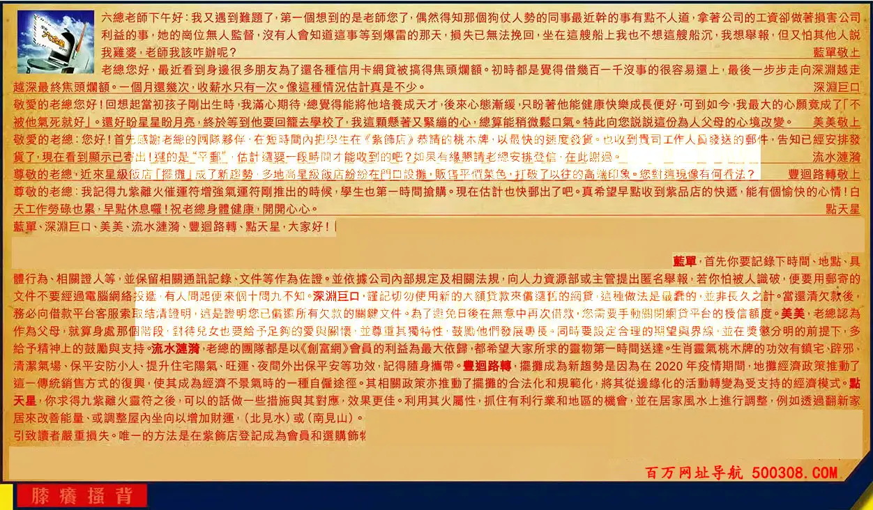 【1】.六總老師下午好:我又遇到難題了,第一個想到的是老師您了,偶然得知那個狗仗人勢的同事最近幹的事有點不人道,拿著公司的工资卻做著損害公司利益的事,她的崗位無人監督,沒有人會知道這事等到爆雷的那天,損失已無法挽回,坐在這艘船上我也不想這艘船沉,我想舉報,但又怕其他人說我雞婆,老師我該咋辦呢?  藍單敬止