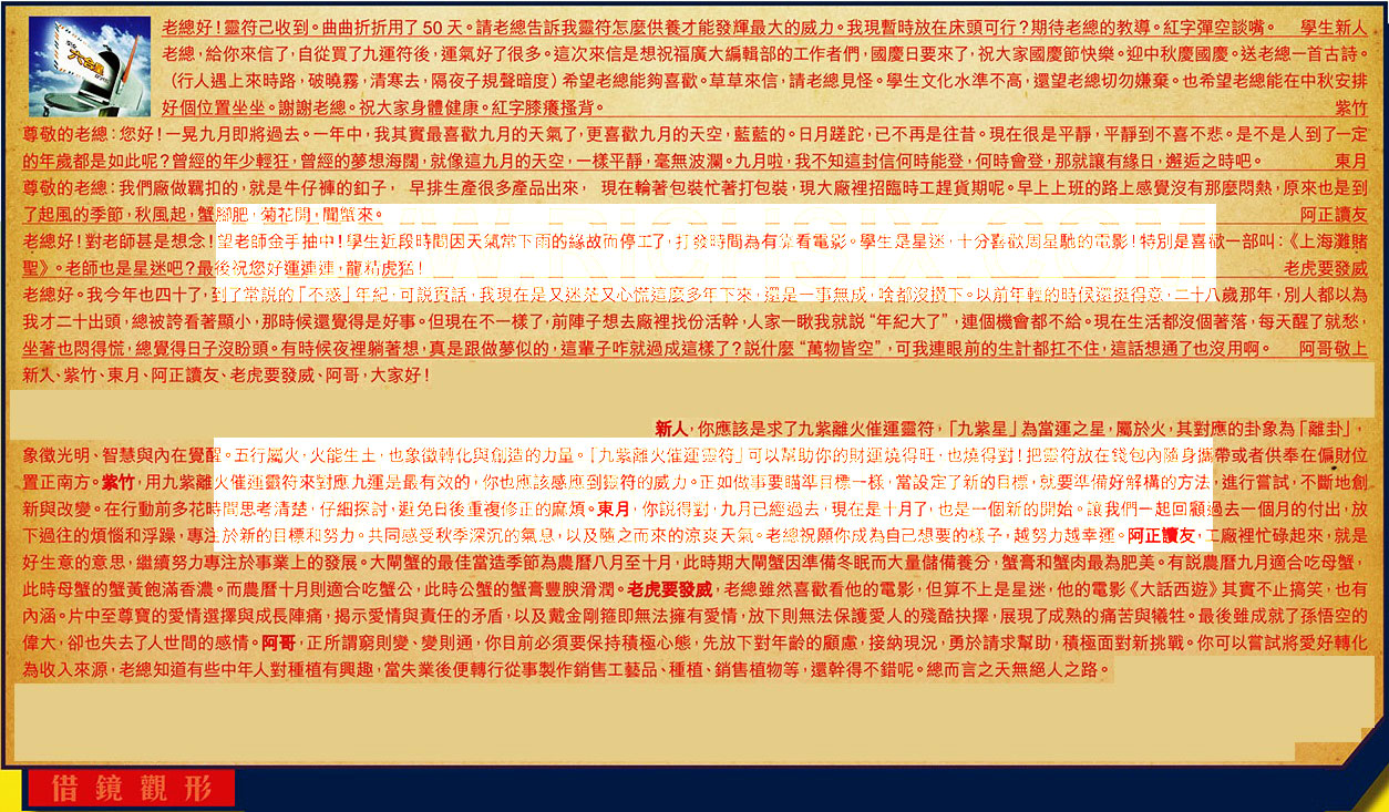【2】.老總,給你來信了,自從買了九運符後,運氣好了很多。這次來信是想祝福廣大編輯部的工作者們,國慶日要來了,祝大家國慶節快樂。迎中秋慶國慶。送老總一首古詩。(行人遇上來時路,破曉霧,清寒去,隔夜子規聲暗度)希望老總能夠喜歡草草來信,請老總見怪。學生文化水準不高,還望老總切勿嫌棄。也希望老總能在中秋安排好個位置坐坐。謝謝老總。祝大家身體健康。紅字膝癢搔背。  紫竹