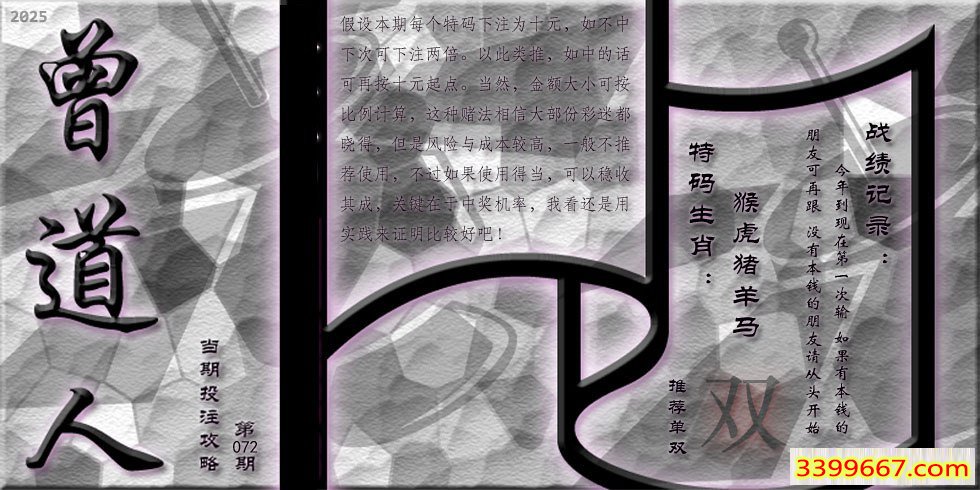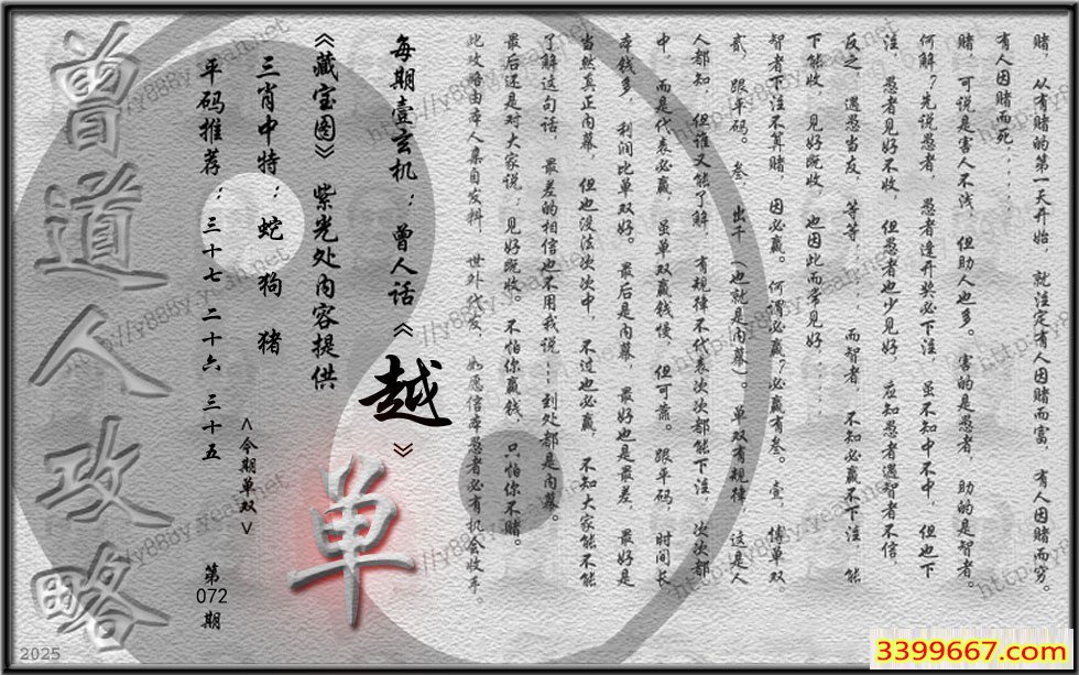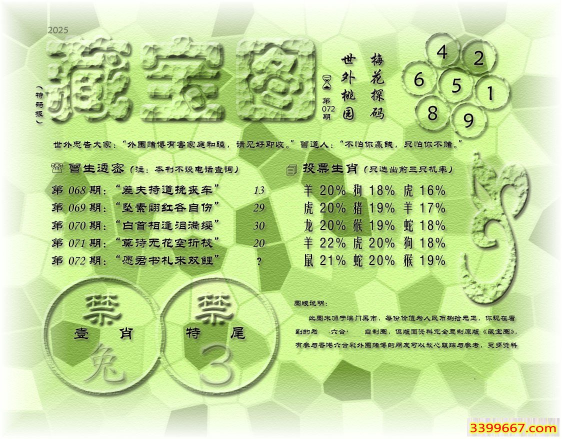 | 主题 :072期藏寶圖 新:门外风波烟浪恶 老:愿君书札来双鲤 禁:兔 禁:3尾 |