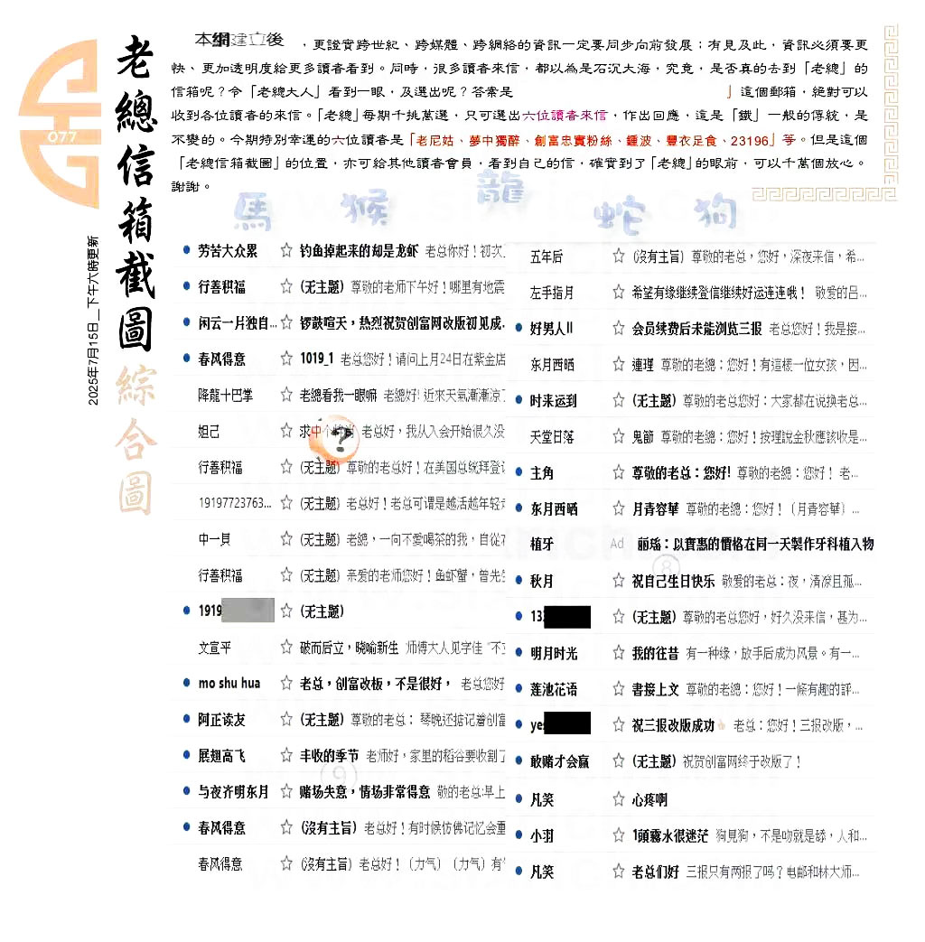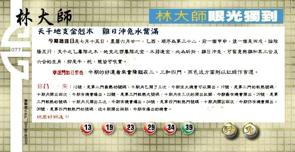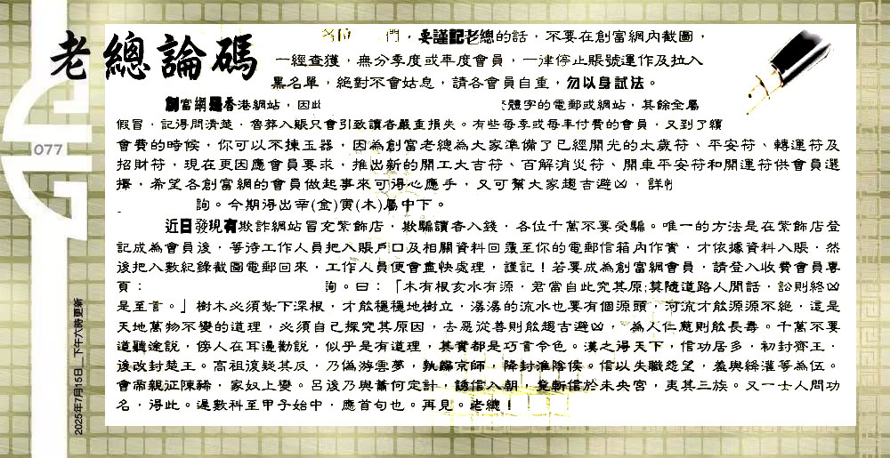 | 主题 :077期:六合皇金句/老总论码/萧公子/林大师/五行夺码/老总信箱截 |