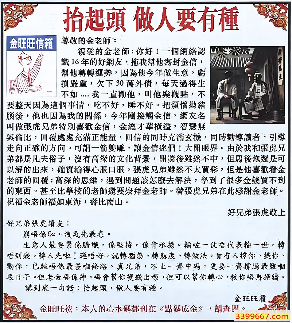 | 主题 :120期:金旺旺信箱彩民推荐→→《抬起頭 做人要有種》 |