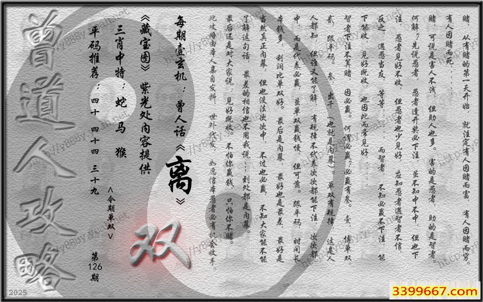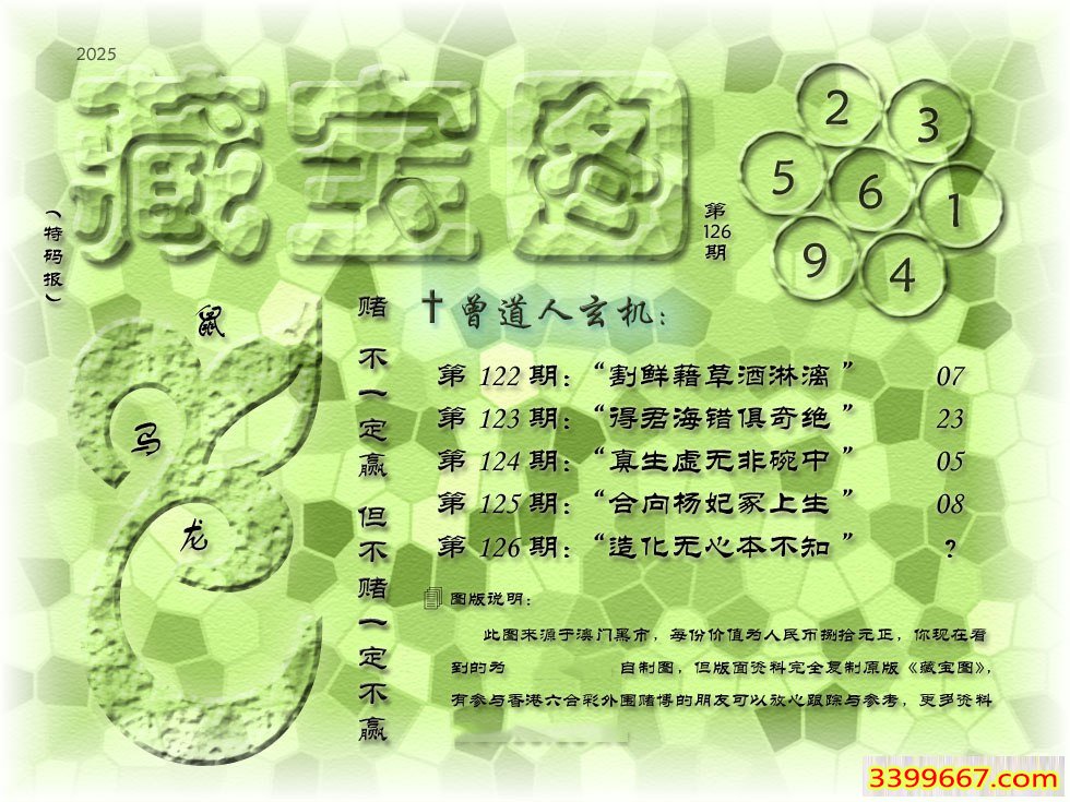 | 主题 :126期藏寶圖 新:造化无心本不知 老:流到前溪无半语 禁:兔 禁:8尾 |